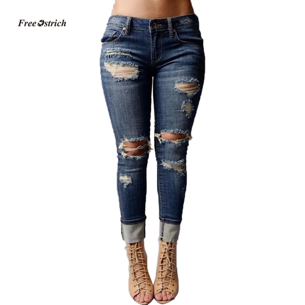 .Pictures for Free Ostrich Clothes Women Jeans Women Mid Waisted Skinny Hole Denim Jeans Stretch Slim Pants Fashion Length hole jean Pants